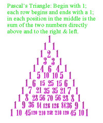 The (k-1)st number in the nth row is the number of different ways that you can choose k items from a set of n items. For example, suppose you have 10 people and you need to make a committee of three people there are 10 choose 3 different committees. go to the 10th row and count out 3+1 or 4 numbers and see that there are 120 different committees you could make.