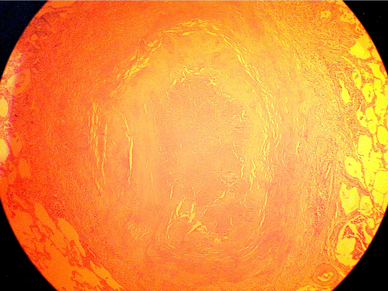 mass of necrosis surrounded by a capsule of fibrous connective tissue.
