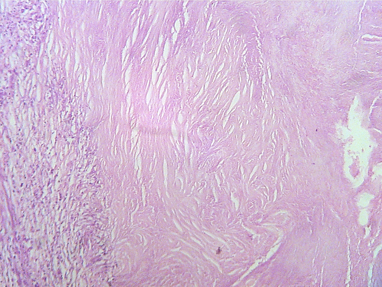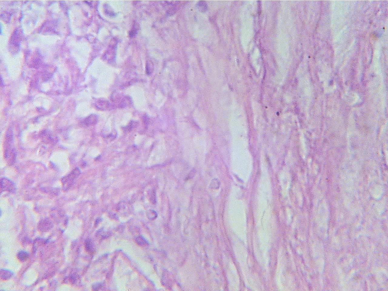 Macrophages (round dark blue at left), fibrous