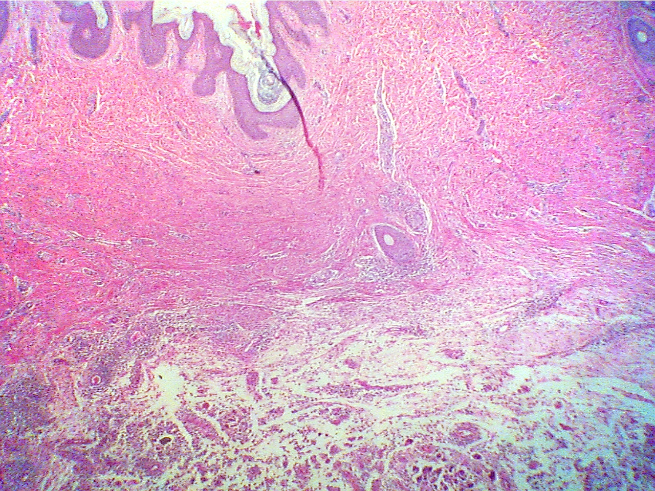 Edge of dermis (fibers at top), pus (scattered cells