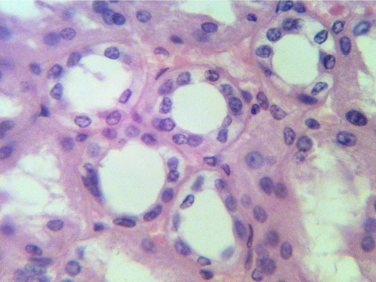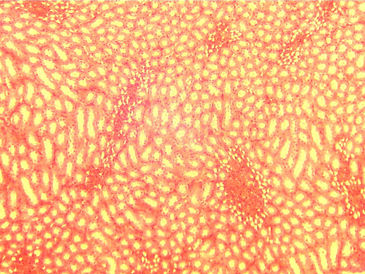 The round cross sections of tubules fill the regions between glomeruli. Each