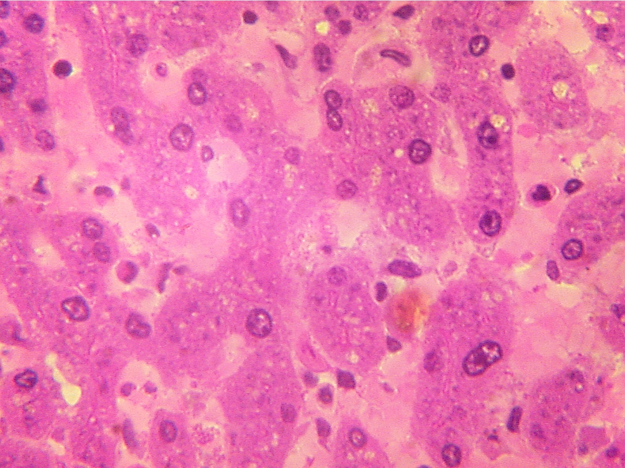 cells, the purple nuclei and pink cytoplasm. Notice the pale colored sinusoids (specialized
