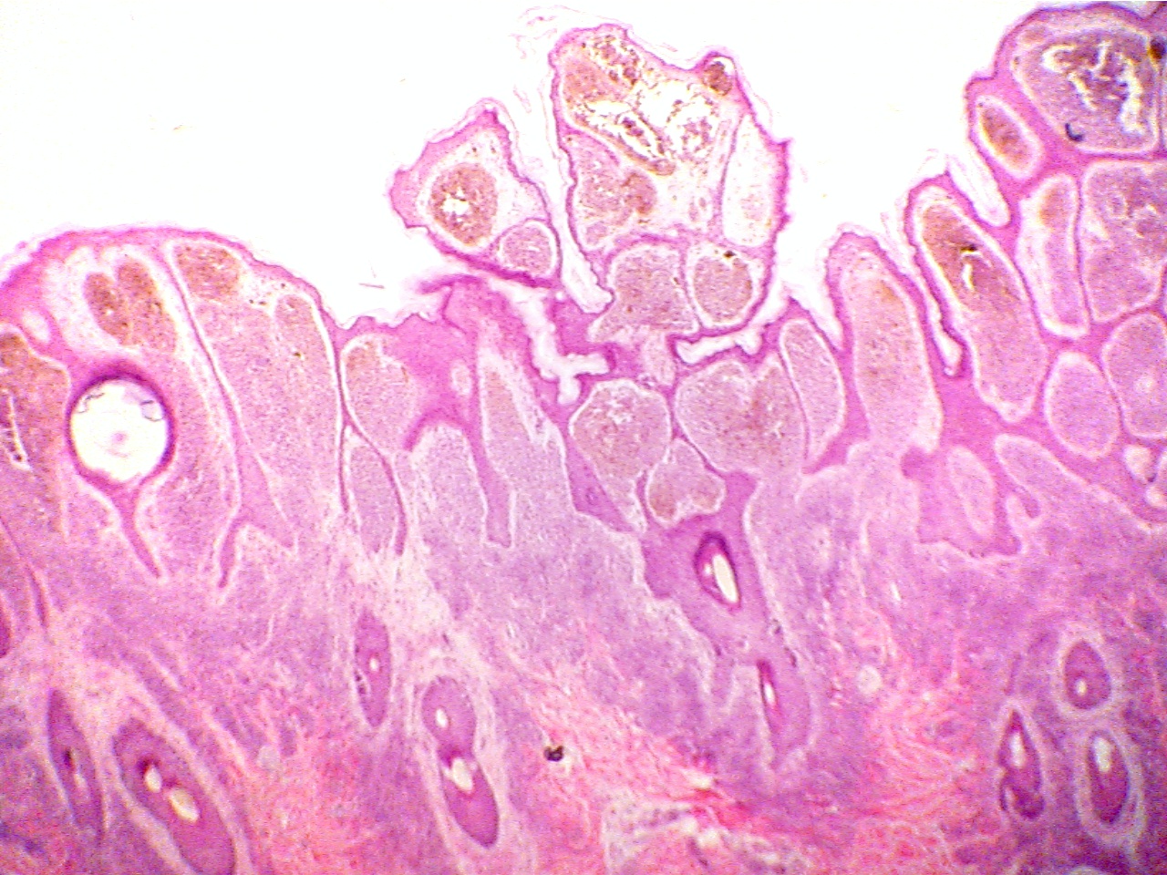 proliferation. The epidermis is very thick and contains excessive accumulations