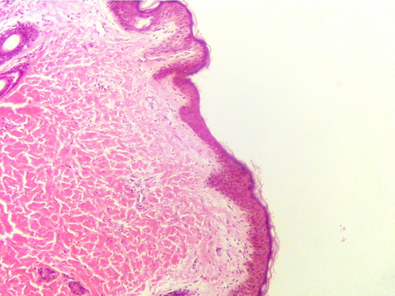 Note that the stratified squamous epithelium of the epidermis has undergone