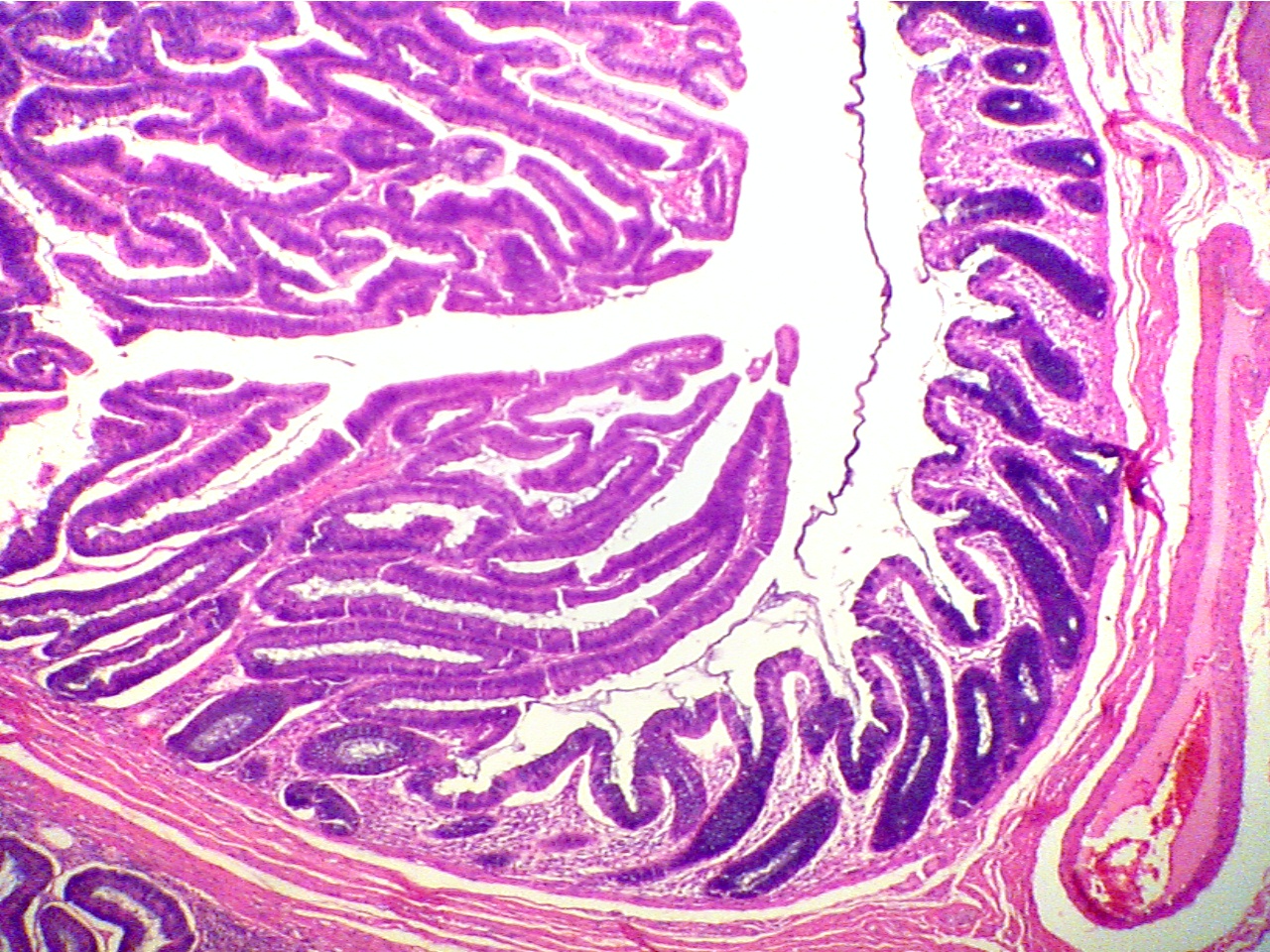 Normal mucosa (thin dark layer) at right, neoplasia (very thick