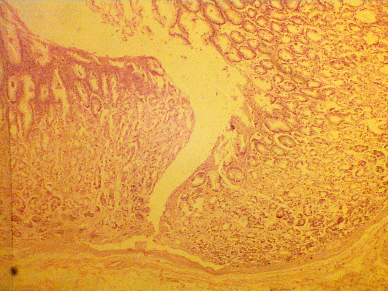 Notice that the inner lining of the stomach consists of a very thick mucosal layer consisting of tall rows of glandular cells running parallel to each other. The thick mucosa has a deep narrow gap extending to the bottom of the mucosa. This gap is the ulcer.